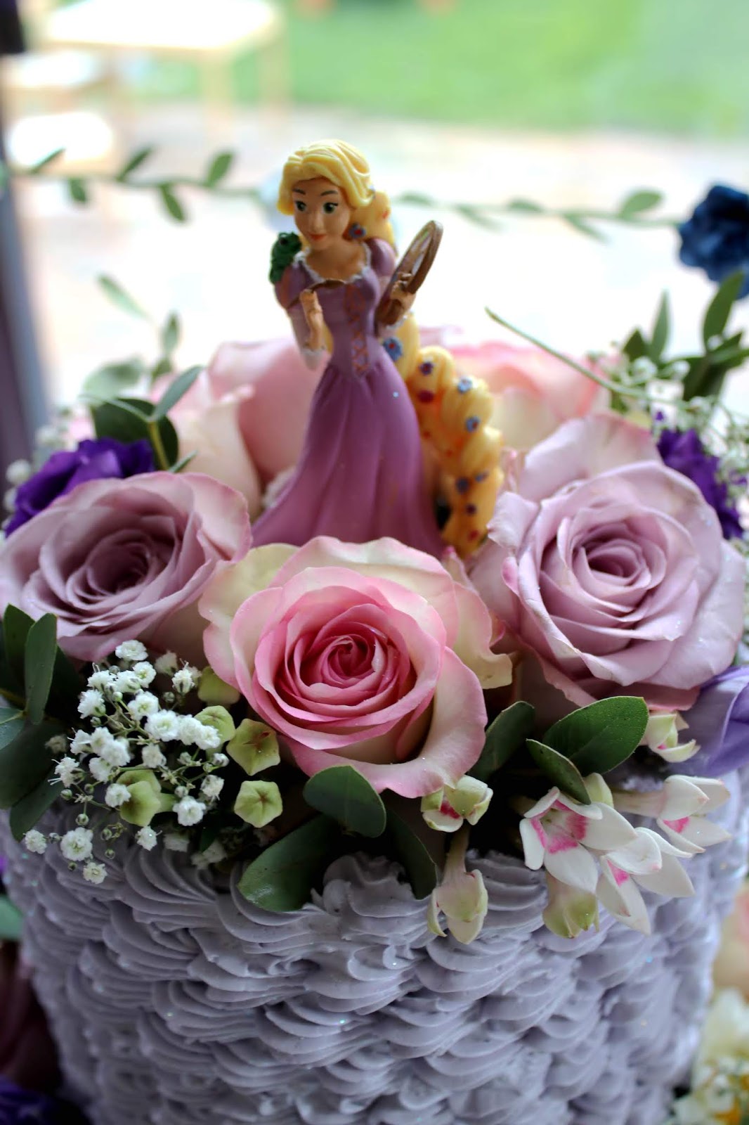 for dessert, I ordered purple cupcakes, and wafer cookies decorated like Rapunzel's braid.